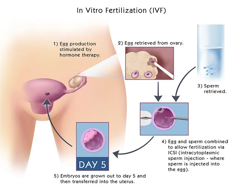 IVF: In Vitro Fertilization. From the Mayo clinic: “During IVF, mature eggs are collected (retrieved) from ovaries and fertilized by sperm in a lab. Then the fertilized egg (embryo) or eggs (embryos) are transferred to a uterus. One full cycle of IVF takes about three weeks. Sometimes these steps are split into different parts and the process can take longer.”